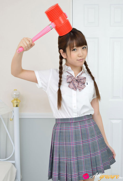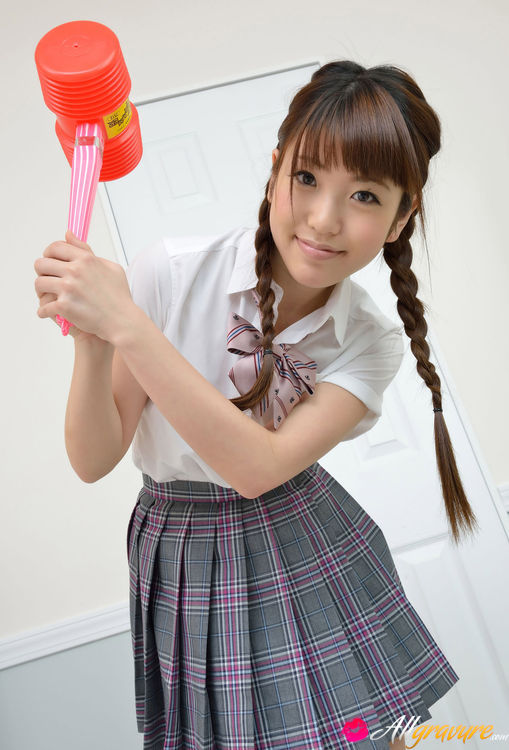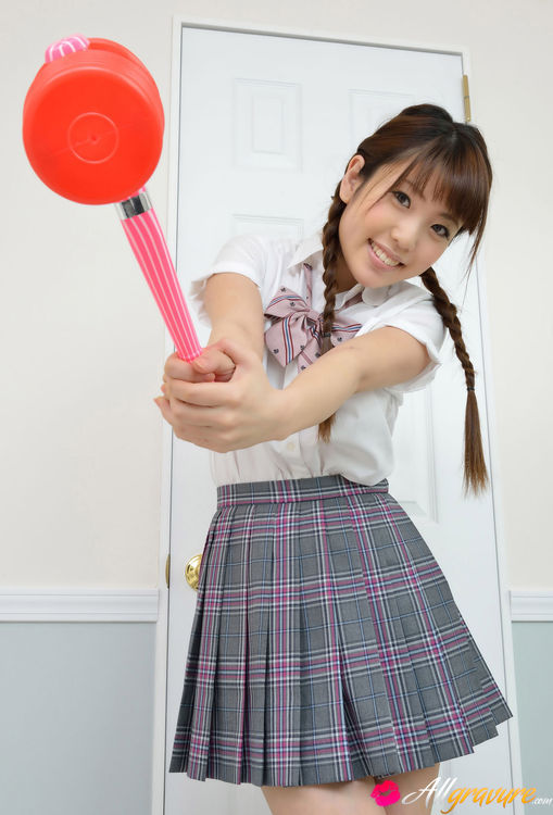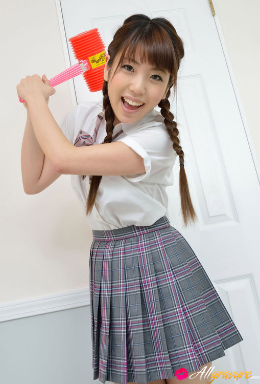 Mizuho Shiraishi Asian with uniform and pigtails plays like child